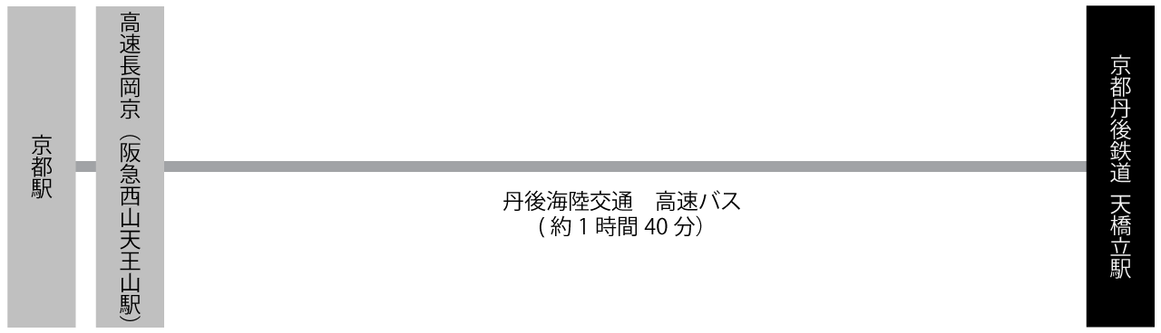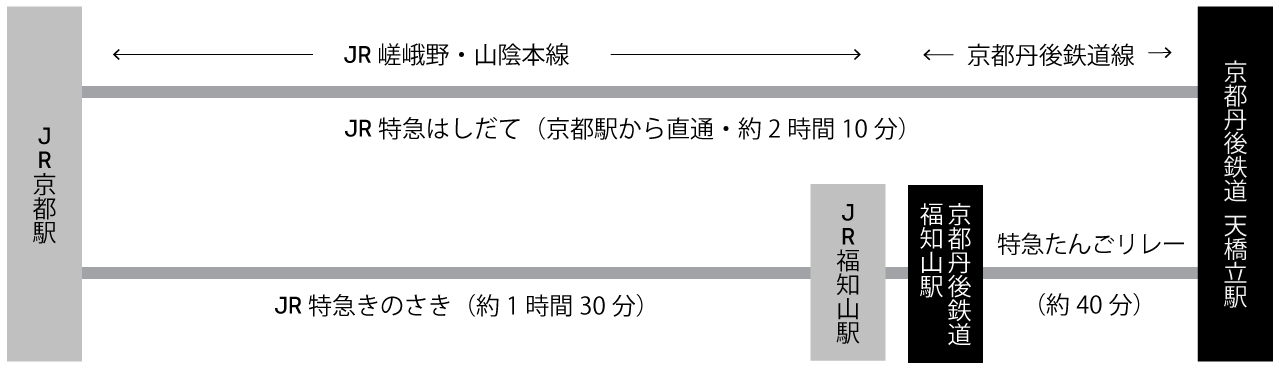 「京都駅」で JR特急はしだて(天橋立まで直通) に乗車、終点「天橋立駅」までご乗車ください。