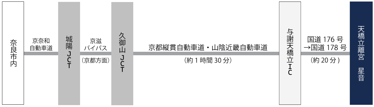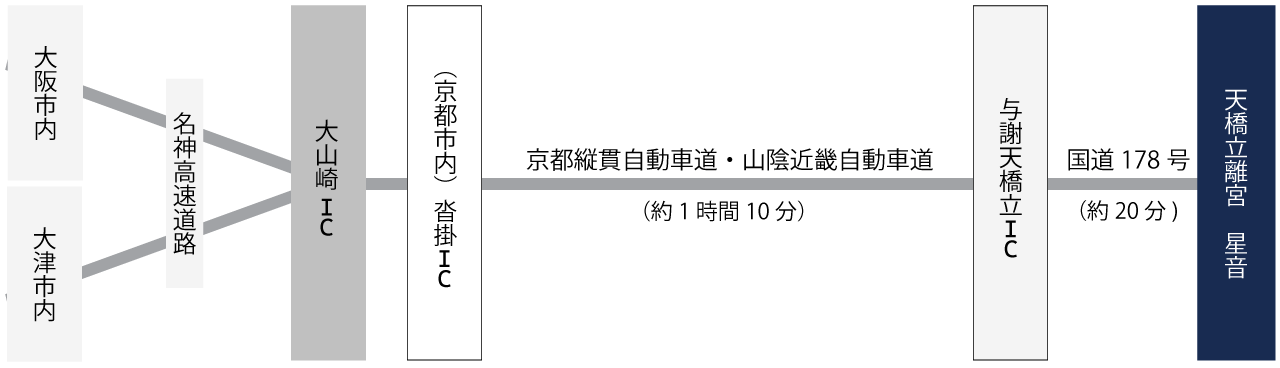 名神高速道路を経由し、大山崎ICより京都縦貫自動車道へお進みください。