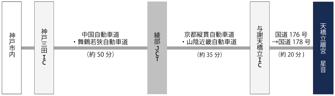神戸三田ICより中国自動車道に入り、福知山ICにて舞鶴若狭自動車道へお進みください。