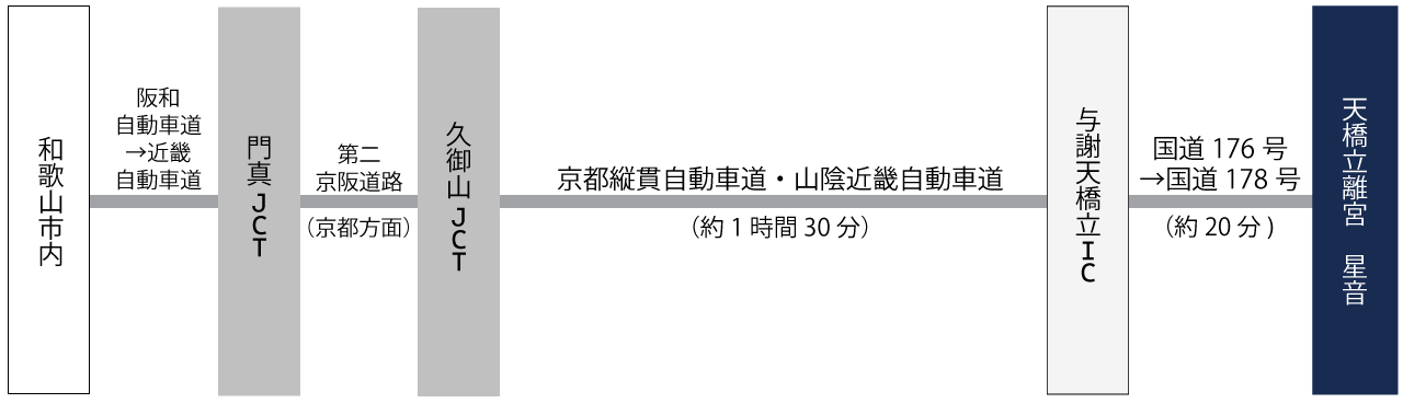 国道9号より沓掛ICから京都縦貫自動車道へ入り、与謝天橋立ICまで進みます。